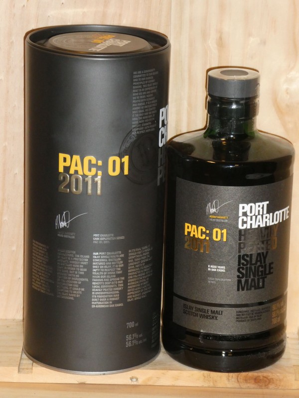 Port Charlotte PAC.01 est un nouveau single malt tourbé de la série Cask Exploration, de Bruichladdich. Distillé en 2011, ce single malt fortement tourbé a d'abord été vieilli en fûts ex-bourbon de premier remplissage puis dans des fûts ayant contenu du vin rouge de la région de Pauillac.